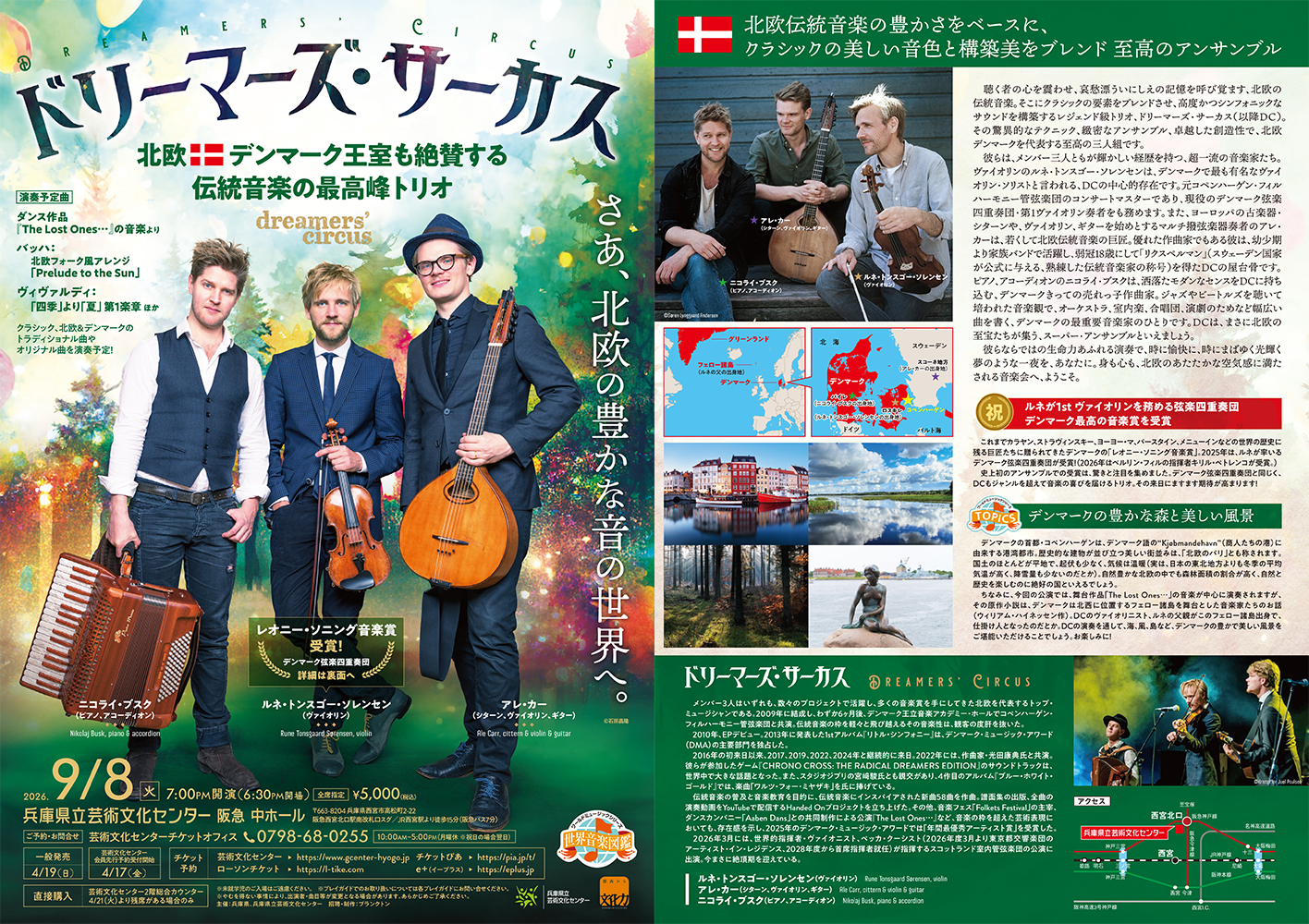 コロナ禍中には、北欧伝統音楽を次世代へ継承・発展させるための壮大なプロジェクト『Handed On』を始動。全58曲の書き下ろし楽譜の出版、演奏動画の全曲配信、そして厳選された楽曲を収録した5作目のアルバム『Handed On』を2025年にリリース(日本先行発売)。活動はこれにとどまらず、2024年5月には、北欧中の伝統音楽アーティストを集めた音楽フェス「Folkets Festival」を主宰し、チケットは完売。同年9月には、ダンスカンパニー「Aaben Dans」との共同制作による公演『The Lost Ones…』が全公演ソールドアウトを記録した。音楽の枠を超えた芸術表現においても、その圧倒的な存在感と人気を証明した。これらの功績により、2025年のデンマーク・ミュージック・アワードでは「年間最優秀アーティスト賞」を受賞。今年3月にスコットランド室内管弦楽団と共演予定。指揮者はスコットランドのセッカ・クーシスト(2026年度より東京都交響楽団のアーティスト・イン・レジデント、2028年度より主席指揮者に就任)。この公演では、著名なヴァイオリニストでもあるクーシストとD.C.が伝統音楽を演奏するとのこと。D.C.は今まさに絶頂期を迎えている。
